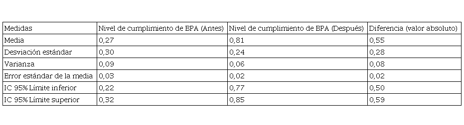 De un total de 139 aspectos verificados en su cumplimiento o no por parte del MFD (sin valores extraviados), en una fase de medición y evaluación posterior a la aplicación del programa de educación ambiental, se obtuvo un promedio de 0,81 (valor más cercano al máximo cumplimiento), junto a una desviación estándar de 0,24, varianza de 0,06 y un error estándar de la media de 0,02. Véase la Tabla 5 con los estadísticos respectivos del diagnóstico y evaluación posterior de BPA.