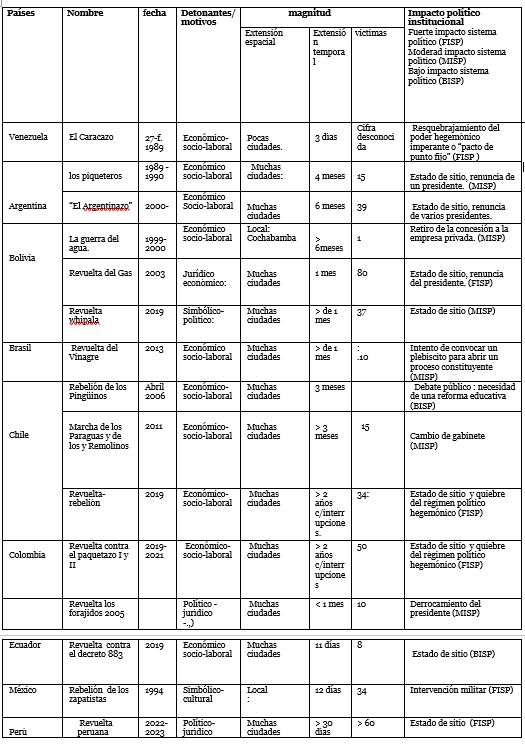 Recalcamos una vez más, la dinámica conflictual violenta (o contestataria, mejor dicho) manifestada actualmente mediante revueltas y rebeliones en nuestro continente no es un dato nuevo, desde hace 500 años cuando los invasores europeos sometieron a nuestros pueblos a formas esclavistas de producción revienta una época de rebeldía social permanente. Solo que en el presente trabajo destacaremos la ola de rebeldía social de gran impacto ocurridas en el periodo (1989 y 2023), un poco más de tres décadas de convulsión social en casi todos los países de la región, fundamentalmente los ubicados en el Sur.