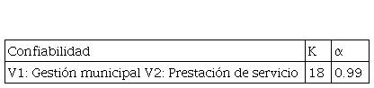 Dicho cuestionario fue validado por expertos además de un análisis de confiabilidad a través del coeficiente de Alfa de Cronbach arrojando en la variable Gestión Municipal un coeficiente de 0.99 y en la variable Prestación de servicio un coeficiente de 0.98 demostrando que posee un nivel de confiabilidad alto. De la misma manera en la Tabla 1 se muestran los resultados sobre el nivel de consistencia entre las variables de estudio, Gestión Municipal y Prestación de Servicio a través del cálculo del coeficiente de Alfa de Cronbach.