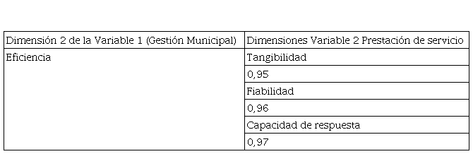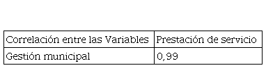 Como se muestra en la tabla 2 se observa la existencia de una correlación fuerte entre la variable gestión municipal y la variable prestación de servicio, lo que demuestra que la identidad de la gestión municipal, midiendo la visibilidad del liderazgo, incide directamente sobre la prestación de servicio.