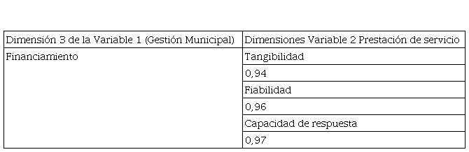 Con base en estos resultados de correlación entre dimensiones se puede mencionar que los encuestados manifestaron no están muy satisfechos con respecto a la capacidad que tienen los trabajadores para atender el trabajo asignado, lo que genera un servicio poco adecuado o deficiente, mostrando poca fiabilidad, esto genera que no siempre estén dispuestos a resolver los problemas que se le presenten a los usuarios, volviendo tedioso el proceso de solicitudes en los servicios. Esto generalmente se acusa deberse a la falta de liderazgo o de una buena planificación para mejorar la gestión municipal. Sin embargo, el sistema muestra una importante correlación de la gestión municipal con la tangibilidad, la confiabilidad y la capacidad de respuesta. Eso significa que el liderazgo de los actores de la política, en este caso, los servidores públicos, es radicalmente fundamental en la percepción de eficiencia y eficacia. La identidad del funcionario central, en este caso, el alcalde, también recibió el mismo tratamiento, revelando que la función municipal es centralmente, o depende centralmente, del liderazgo de las personas que representan dicha función. Esto deja por fuera o secundariza la relación objetivo-resultado, normalmente tan apreciada en la literatura sobre gestión de gobierno y gestión municipal.