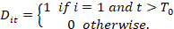 It is further assumed that the results of the untreated units are not affected by the intervention implemented in the treated unit. Therefore, let be the effect of the intervention on unit at time and be a dummy that assumes value 1 if unit is exposed to the intervention at time and zero otherwise. The observed result of unit i at I time t is given by: