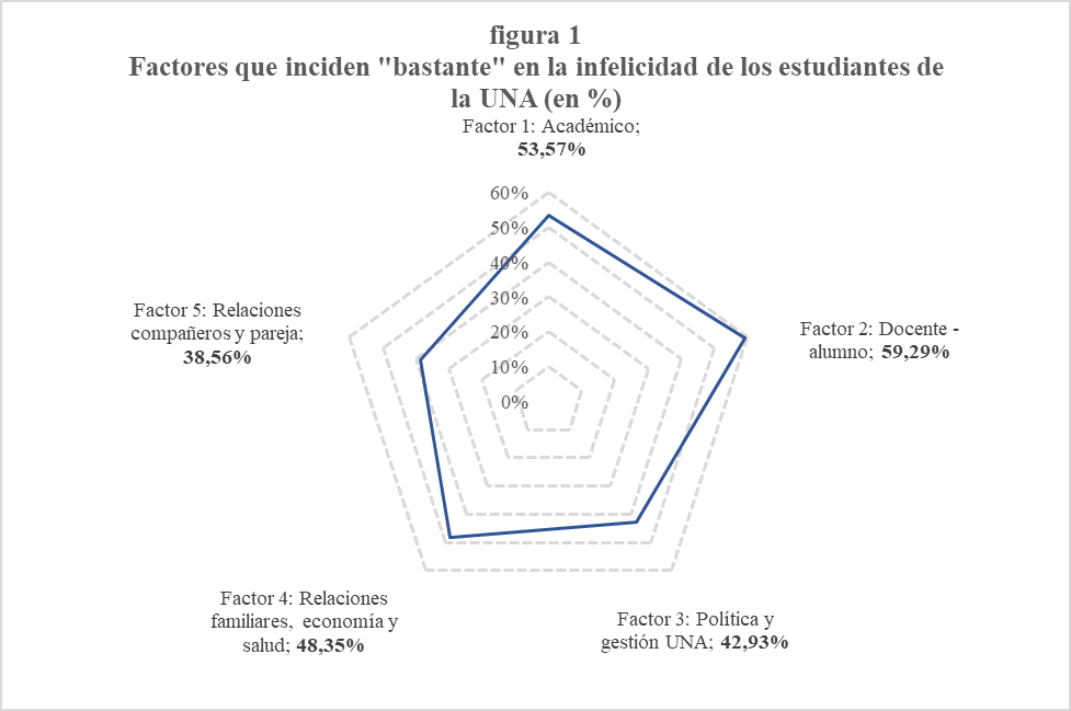 En la figura 1 se observa la cantidad porcentual del total de afirmaciones que se encuentran en la escala de “bastante” y que, por consiguiente, inciden como factores de infelicidad en el rendimiento académico; la relación docente–estudiante; la política y gestión universitaria; la familia, la economía y la salud; y las relaciones entre compañeros, amigos y pareja.