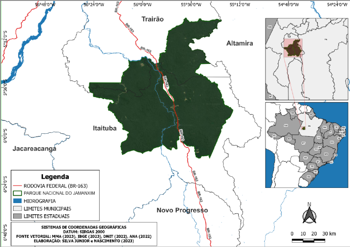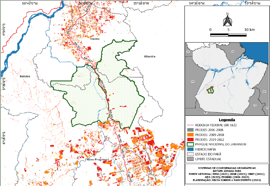 A sub-região Vale do Jamanxim, na Amazônia paraense, onde está localizado o Parque Nacional do Jamanxim, entre os municípios de Novo Progresso e Trairão, lócus da pesquisa, é cortada longitudinalmente pela rodovia BR-163 que interliga a cidade de Cuiabá, no Estado do Mato Grosso, à cidade de Santarém, no Estado do Pará, a qual foi construída na década de 1970, no contexto político nacional de integração e modernização da Amazônia Legal e promoveu consideráveis alterações na estruturação do espaço, com enfoque no estabelecimento de atividades diversas, sobretudos humanos e seus desdobramentos conflituosos que caracterizam a região como zona de fronteira.