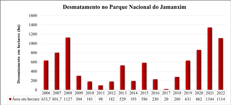 O Gráfico 1 apresenta uma série histórica do desmatamento no interior do Parna do Jamanxim, numa periodização de 2006 a 2022, a partir de dados do PRODES/INPE, com o propósito de evidenciar os impactos dessas atividades e traçar alguns caminhos de reflexão que justifiquem essas inconsistências legais.