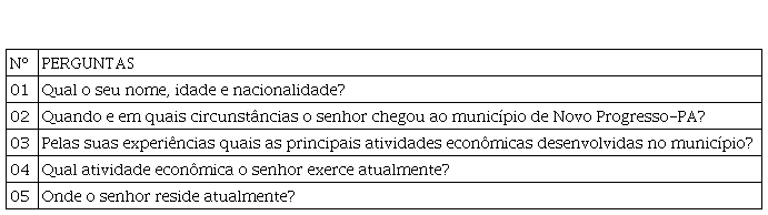 Fora realizada uma entrevista semiestruturada (Quadro 1.), junto ao Sr. C. A. B, migrante paranaense de 76 anos que possui empreendimentos na sub-região do Jamanxim, com o fito de destacar o processo de migração e a heterogeneidade da sociedade que se instalou na região. Segundo Rosa e Arnoldi (2006) a entrevista semiestruturada possibilita a inclusão de roteiros não previstos, por ser uma técnica flexível proporciona a obtenção de riqueza informativa intensiva, holística e contextualizada.