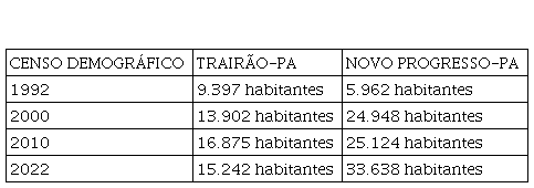 À vista dessa migração para a referida sub-região, os dados dos quatro últimos Censos demográficos (Tabela 1.) demonstram o crescimento populacional do município de Novo Progresso-PA, criado através da Lei nº. 5.700, de 13 de dezembro de 1991 e a população do município de Trairão-PA, criado por meio da Lei nº 5.695, de 13 de dezembro de 1991.