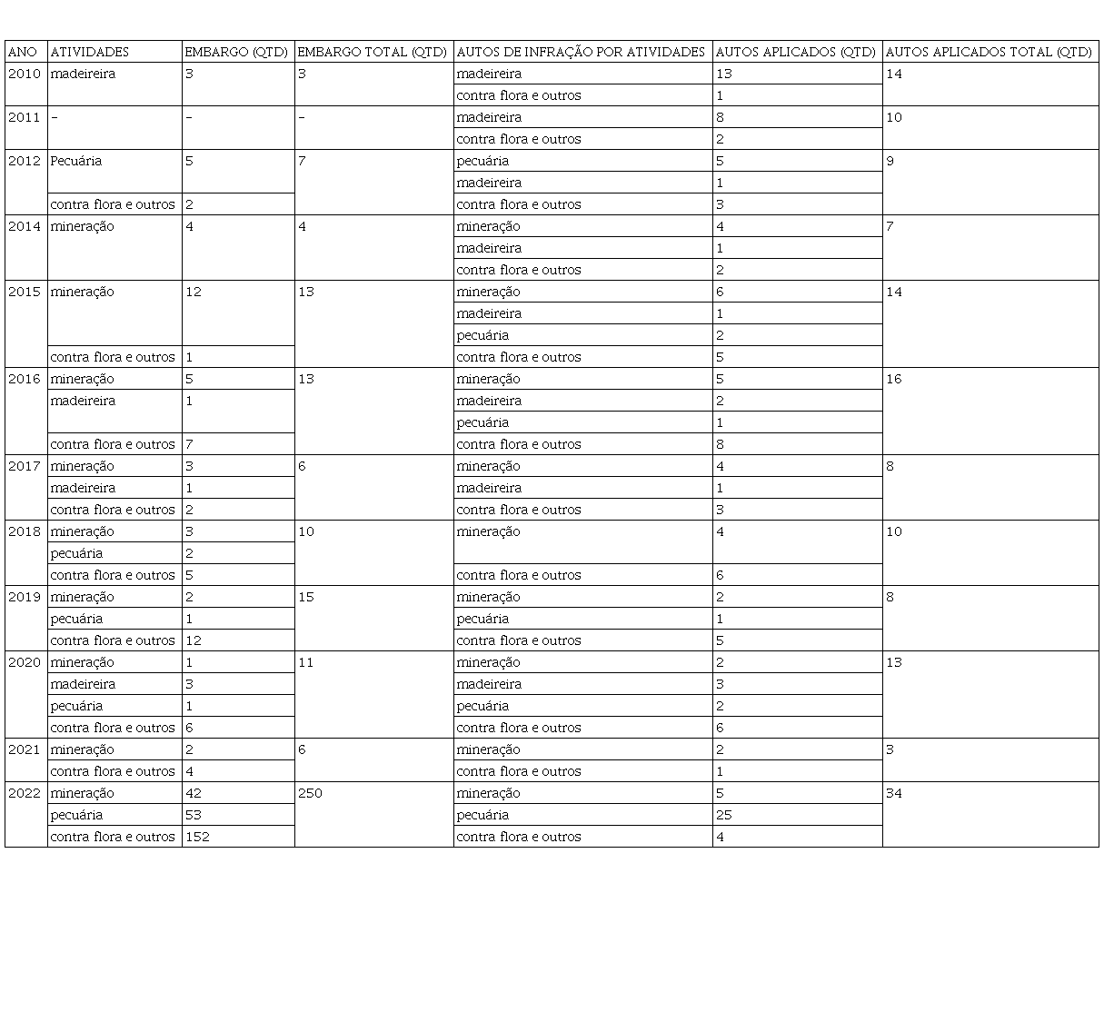 Neste ponto, pode-se observar que a fronteira mineral não foi retraída após a criação do Parque, o que tende a ocorrência de crimes ambientais como extração e destruição de sua flora e fauna, isso fica evidente quando observamos os dados de embargo e autos de infração por extração ilegal de minério (Quadro 1), no período de 2010 a 2022, dos 332 embargos, 78 estão ligados a extração ilegal de minério, representando 22% do embargo total, ao qual, alguns embargos recaem em áreas que possuem ANM com processos ativos no interior do Parna.