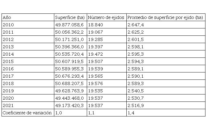 Al considerar la tierra como un bien común en México, de acuerdo con el Registro Agrario Nacional (2021), del total de la superficie nacional el 51%, equivalente a 9.972.900.820,78 hectáreas es tierra de propiedad social, es decir, pertenecientes a ejidos o comunidades, En particular el número de ejidos registrados con tierras destinadas al uso común crecieron significativamente en el período de 2010 a 2018. En el año 2019 se registra una disminución a un valor comparable al año 2016. En cuanto al número de hectáreas de tierra ejidal destinadas al uso común creció significativamente, así como el número de ejidos en el período de 2010 a 2018, Sin embargo, la superficie común por ejido disminuye significativamente cada año un promedio de 6 hectáreas. A partir del año 2019 las cifras se mantienen sin variación significativa (Tabla 2).
