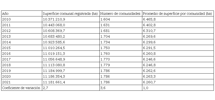 En contraste, las tierras registradas pertenecientes a comunidades crecieron significativamente en el período 2010 a 2021, tanto en el número de comunidades (más de 16 en promedio por año) como en la superficie total (más de 77 mil hectáreas en promedio por año). Sin embargo, el promedio de superficie por comunidad decreció significativamente (un promedio de 14 hectáreas por año). Véase Tabla 3.