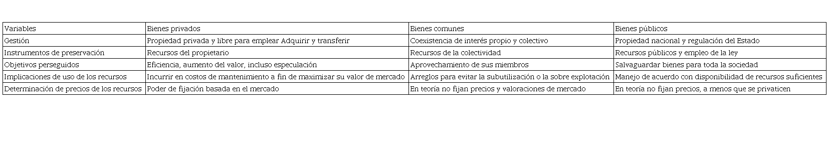 Se ha señalado aquí que los derechos de propiedad son fundamentales para dar certidumbre a la inversión. La tarea más importante del Estado es la de hacer valer las leyes que ha creado para privilegiar el bienestar de la población. De hecho, la autogestión de los bienes comunes se plantea como una propuesta intermedia a dos esquemas opuestos: los bienes privados, por un lado, y los bienes públicos. por otro (véase Tabla 4).