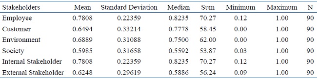According to the statistics presented in Table 2, the employee stakeholder presents higher mean and median, and lower standard deviation. That is, the descriptive analysis already reveals a higher level of meeting interest of the employee stakeholder, the only internal stakeholder in the total sample analyzed. The environment stakeholder presents second highest average, followed by the buyer and by society. Grouping the external stakeholders, we observe that the mean and median are lower than the internal stakeholder. In the GRI structure, there is a greater number of indicators associated with external stakeholders, when the indicator did not apply to the type of organization, we withdrew the analysis indicator. Thus, in a descriptive way, a prioritization of the internal stakeholder is observed in comparison with the external stakeholders.