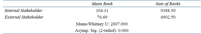 The first specific objective of the research is to identify the stakeholder prioritization of the companies. For this purpose, the first research hypothesis was proposed: Internal stakeholders have a higher level of meeting their interests than external stakeholders. Table 3 presents the results of the Mann-Whitney test comparing the groups of internal and external stakeholders in the total sample.