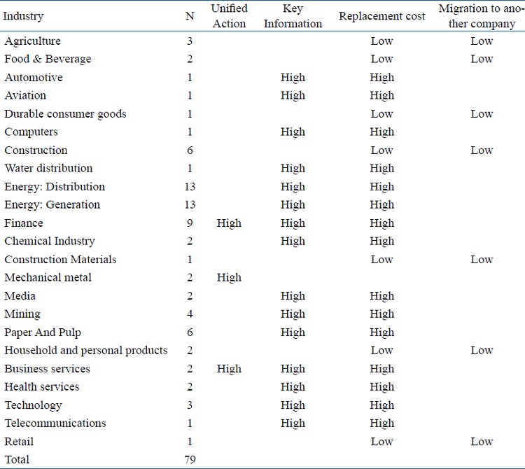 Industries that present more specialized activities also demand professionals with critical skills, which have a high replacement cost and greater difficulty in migrating to other companies, such as in the energy, water, chemical, mining and paper and pulp industries. Service companies are also dependent on human capital, which have a high replacement cost (DALBEM; BASTIAN-PINTO; ANDRADE, 2014), as in the financial, trade and health services industries. On the other hand, professionals in agriculture have low schooling and perform a less sophisticated and dynamic activity (HOFFMAN; NEY, 2004). In the construction industry there are also low-skilled workers and a trend of high mobility of labor (ARAUJO JUNIOR; NOGUEIRA; SHIKIDA, 2012). In this sense, in the agriculture and construction industries the employees have low power.