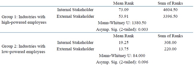 To test the influence of the industry on prioritization, we grouped the industries with high-level employees in the first group and the industries with low-level employees in the second group. Group 1 - industries with high-power employees - is composed of 63 companies, and Group 2 - industries with low-power employees - is composed of 16 companies. We used the Mann-Whitney test to evaluate whether the level of meeting internal stakeholders’ (employees) interests is higher in the companies of the first group, and if it is lower or neutral in the companies of the second group. The test results are presented in Table 5.