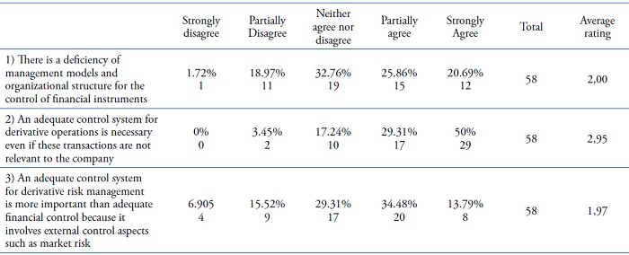 We obtained a percentage of 22.5% of the auditors that do not agree partially or totally with an adequate control system of derivative risk management. Perhaps because the financial control is considered greater than the control of derivatives. However, 49% of the auditors agreed with the statement. Accordingly, the procedures for analytical review of the internal controls contained in AU Section 342 corroborate the mitigation of audit risk, however, as the research indicates, it does not completely remove the flaws in the verification process. Respondents in the accounting area tended to disagree with this assertion (p-value = 0.0453).
