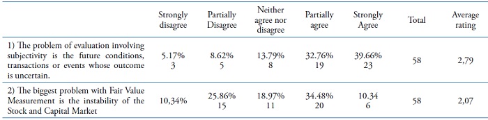 The second issue points to the greater problem of measuring fair value, the instability of the stock and capital market. The issue obtained 20 auditors who partially agreed, representing 33% of the sample. 15 auditors partially disagreed, representing 25%, and 11 auditors neither agreed nor disagreed. The characteristics of the respondent did not influence the response, according to the Logit model.
