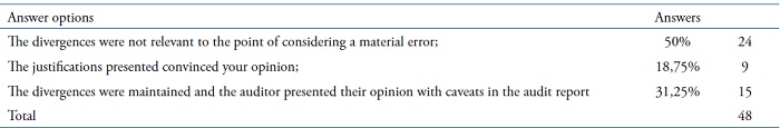 An issue that drew attention in the research was the causes and divergences of accounting estimates made between the auditors and the administration. Fifty percent of the respondents did not consider disagreements as material, however 31.25% stated that the divergences were maintained and were subject to reservations in an audit report.