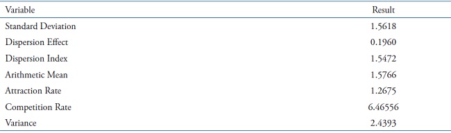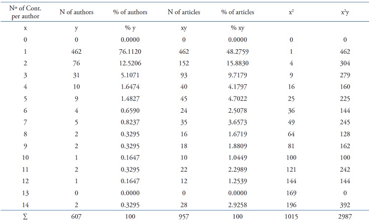 We emphasize that in the second moment we verify if the frequency of the production of the authors comes from a distribution of the Poisson’s Lagrangian type, establishing the 95% confidence level, as well as testing the hypothesis in Table 2: