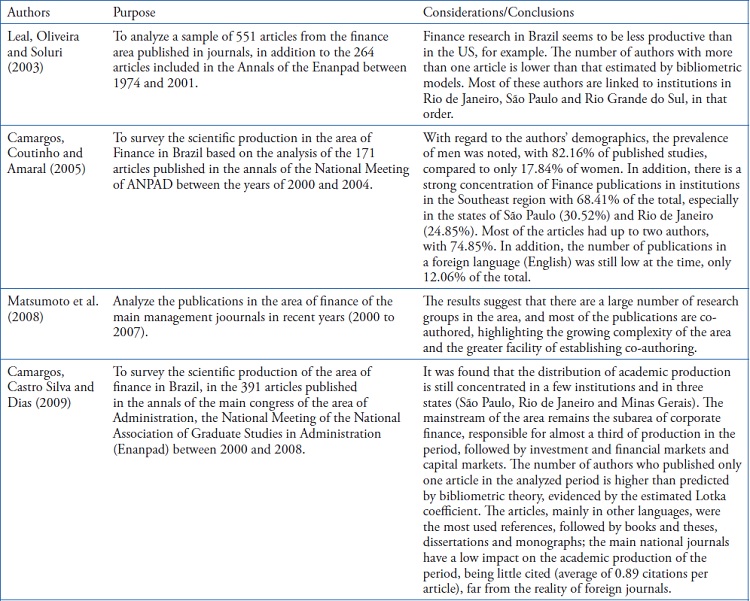 In Brazil, the area of Finance has also been contemplated with bibliometric research, such as the one undertaken in this article, as shown in Table 1.