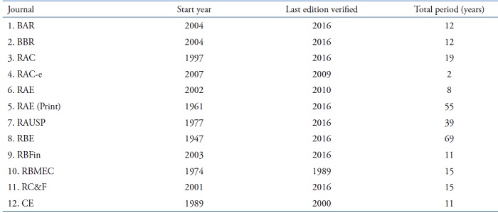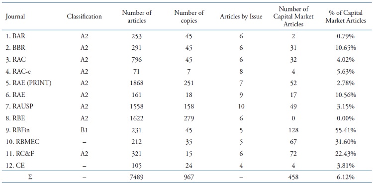 Leal, Almeida and Bortolon (2013) examined the sample of Leal, Oliveira and Soluri (2003), adding a few more journals from the Administration area and related areas that publish Finance articles from time to time, in the period from 2000 to 2010, totaling 11 scientific journals.