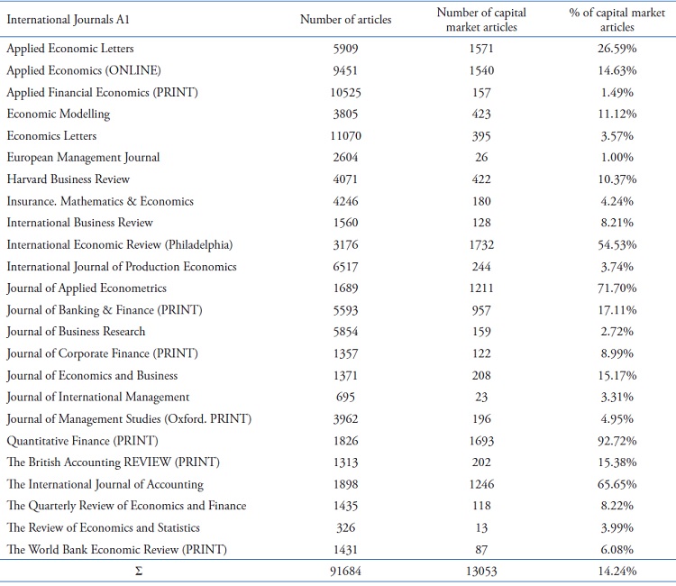 Based on the presented in Table 3, we can identify that 6.12% are specifically about capital markets, with regard to articles produced in Brazil, in journals with higher rankings (predominantly A2). Possibly this result is consistent with the Brazilian profile in the capital market, and it is possible to establish a comparison with Table 4: