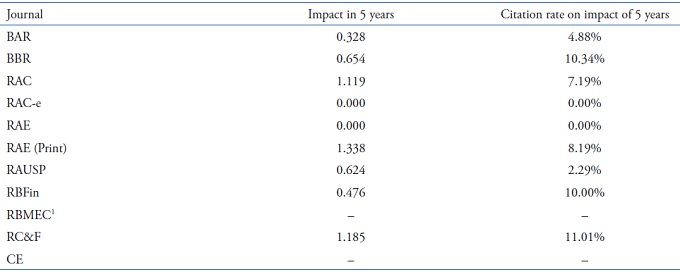 Table 6 shows that RAE (Print) and RC&F, respectively, are the periodicals that have the most impact in the period between 2010 and 2015. As for the impact rate on citations that occurred in the same period, RC & F and BBR are the journals that presented the highest periodicity respectively.
