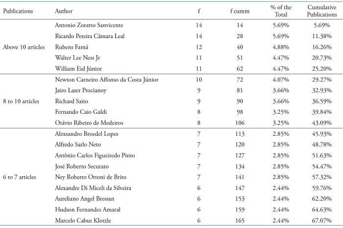 The authors in Table 7 represent 6.26% of the total number of authors who published articles in the sample. However, its production represents 54.59% of the total Capital Market items found. Another finding is that the authors who published more than 6 articles (15 authors) represent almost 31% (30.79%) of all the production of Capital Markets articles found.