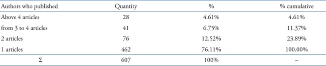 The majority of the authors, 76.11%, 462 out of a total of 607 authors, published only once. On the other hand, those who published twice totaled 76, representing 12.52% of the total. Only 6.75% of the authors published above 3 articles and, when we observe publications above 4 articles only 4.61% of the total authors presented this frequency. We present these characteristics in Table 8: