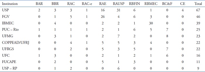 In order to identify the origin of the productions, we verified the institutional links of the authors and, thus, we find several institutions, of which we selected the 10 with most participation in publications, namely: Getúlio Vargas Foundation (FGV); Capixaba Institute for Research in Accounting, Economics and Finance (FUCAPE); Brazilian Institute of Capital Markets (IBMEC); Institute of Postgraduate and Research in Administration of the Federal University of Rio de Janeiro (COPPEAD/UFRJ); Pontifical Catholic University of Rio de Janeiro (PUC - Rio); University of São Paulo - Ribeirão Preto (USP - RP); University of São Paulo (USP); Federal University of Minas Gerais (UFMG); Federal University of Ceará (UFC); Federal University of Rio Grande do Sul (UFRS). It should be noted that, despite representing the majority of authors, the accumulated production of these institutions represents 32.40% of the total production of all institutions. Therefore, we analyzed the frequency of articles published by institution, correlating to the journal, presented in Table 9: