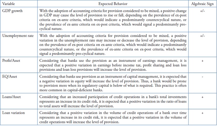 Based on the linear regression models used in previous studies, we developed an econometric model capable of identifying the relation between provision and business cycles. Considering accounting and macroeconomic variables, the assumption of the model was that the provision may be being influenced essentially by the following elements: management of credit risk; earnings management; capital management; GDP behavior and unemployment rate behavior.