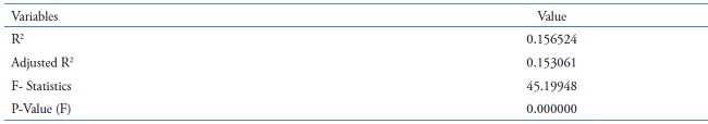 The coefficient of determination (R2) indicates that the independent variables are associated with 15.65% of the behavior of the dependent variable. The statistic F, with p-value equal to 0.000000 confirms the statistical significance of the set of independent variables in the identification of the association between the behavior of the dependent variable and the behavior of the independent variables. These results are in Table 4.