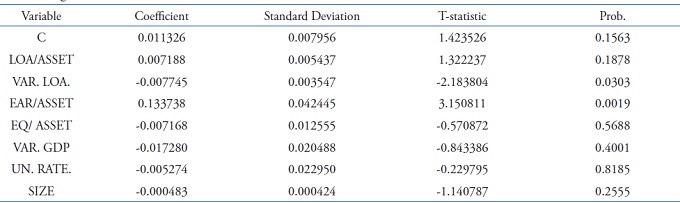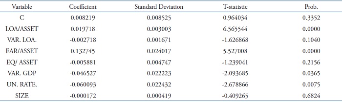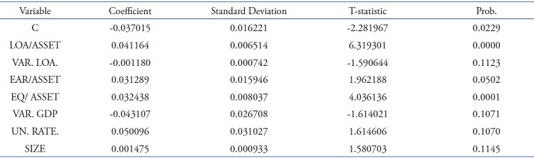 The loan growth variable was only significant at a significance level of 10%. It is therefore not so safe to say that the behavior of provisions is associated with the variation in the volume of loans. The coefficient showed a negative sign, signaling that provisions tend to decrease when credit operations balances increase. Such a finding runs counter to the assumption that there was a positive relationship between the real growth in the volume of credit operations and provisions.