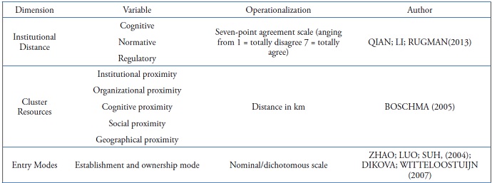 We based the questionnaire on empirical and theoretical studies. The entry mode used nominal variables with binary coding (0 = greenfield and wholly owned subsidiary; 1 = joint venture and acquisition), adapted from Zhao, Luo & Suh (2004). We adapted the DI construct (consisting of 6 questions) from Qian, Li & Rugman (2013). To measure the construct of cluster resources, we used 5 dimensions: institutional proximity (RC_INST - 6 questions), organizational proximity (RC_ORG - 4 questions), cognitive proximity (RC_COG - 5 questions), social proximity (RC_SOC - 5 questions) and geographical proximity (RC_GEO - 4 questions), which were adapted from the theoretical study by Boschma (2005). The operationalization of the variables is represented in Table 1.