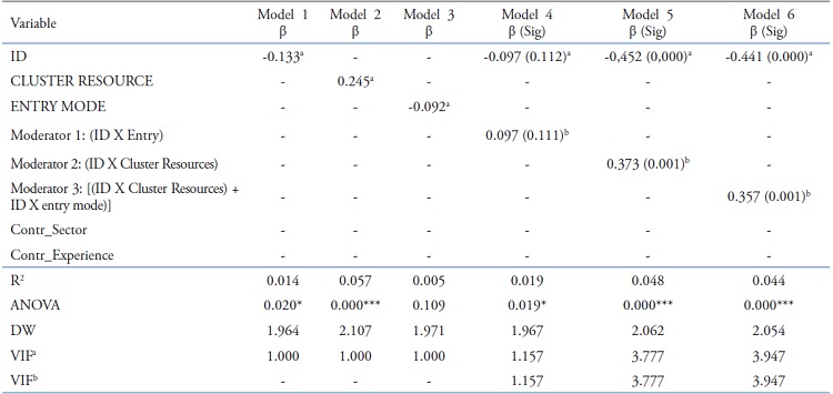 In this study, we used two moderation variables independently (HAIR et al., 2009). In a nutshell: Cluster resources and entry modes. For the final model, we used the two moderation variables simultaneously in the relationship between ID and performance.