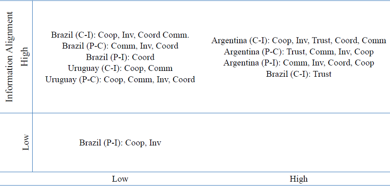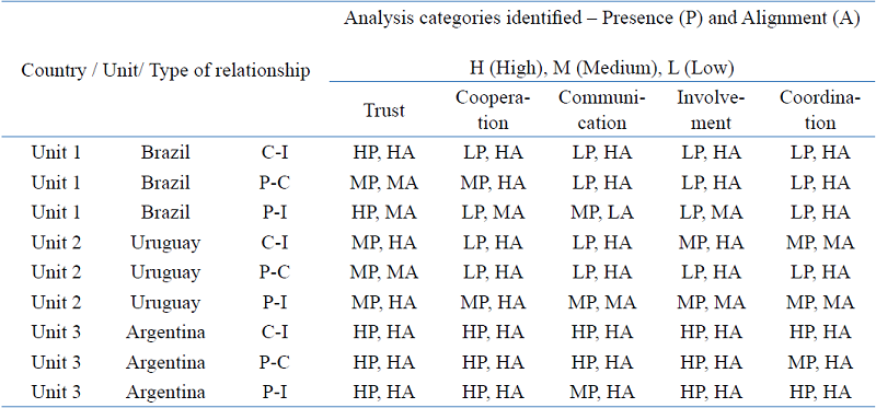 As the focal company in this study is the industrial plant, we assume that all the analysis variables ought to be both positive and important to relationships and should therefore be present. We found several relationships in this categorization. In the unit in Brazil, in the C-I (Consignee / Industry) relationship, we found that the presence of four of the five categories were low, except for trust. The situation was the same for the coordination, involvement and communication categories in the Producer / Consignee (P-C) relationship. In the Producer / Industry (P-I) relationship, there was an identical incidence for the coordination category. In the Uruguayan unit, this situation occurred in the Consignee / Industry (C-I) relationship with the cooperation and communication categories, and in the Producer / Consignee (P-C) relationship with the cooperation, coordination, communication and involvement indicators. The Argentinian unit had no low presence and high alignment levels in this study for any of the categories studied.