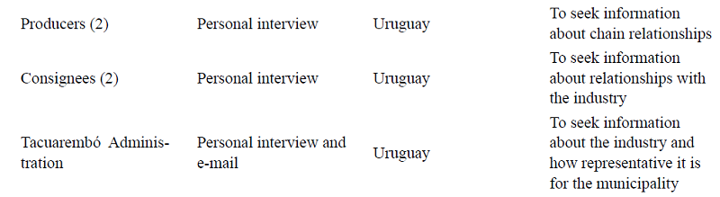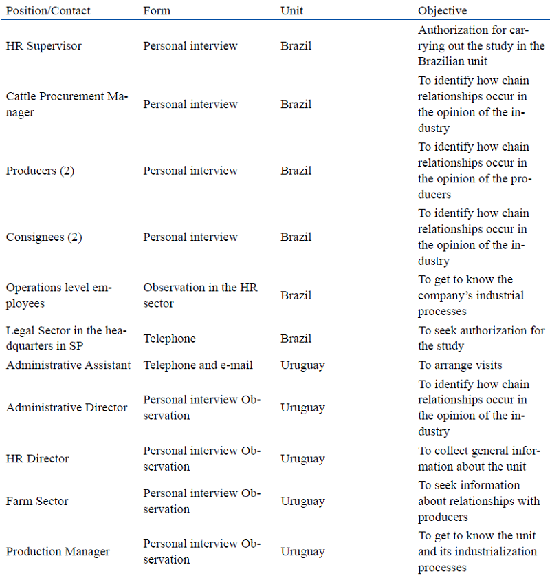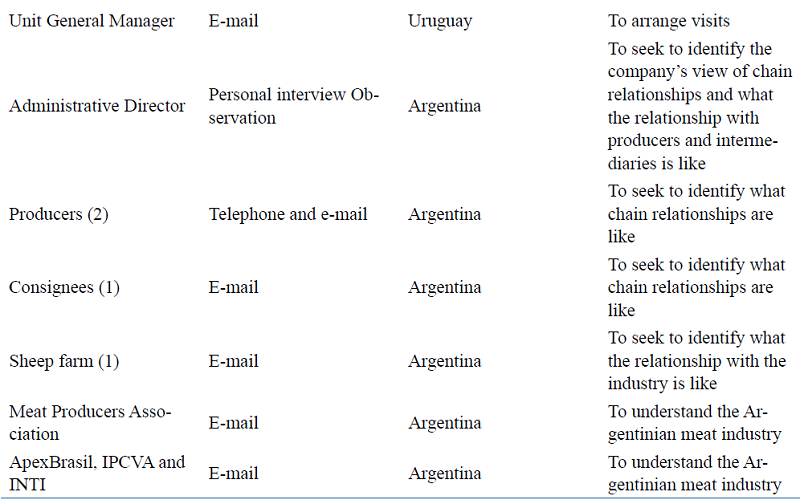 We conduct the pre-arranged interviews in the respondents' work environment and in the country's official language. We interviewed managers from Brazilian, Uruguayan and Argentinian units, and suppliers (producers and consignees) from all three countries. We first transcribed the interviews by writing them out by hand and then inputting for future analyses using the Sphinx Brazil program.