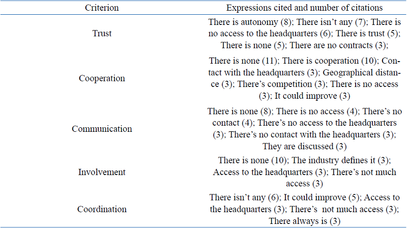 Following the data collection, we coded and then analyzed them on the basis of this coding. Data analysis used elements of narrative analysis. Webster and Mertova (2000) define narrative as a series of human stories related to experiences. This study fits what Riessman (2007) called thematic analysis. Even if narrative analysis initially chose to address the informal or more spontaneous situations of the players involved, over time semi-structured interviews became an accepted way of collecting and analyzing data (Mishler, 1986). The emphasis in this case is more on the content of the text. Thus, we focus more on "what" was said rather than on "how" it was narrated. The analytical coding of 'presence' is based on concepts, which for Gibbs (2009), are the analysis categories taken from the literature review. The analysis categories resulting from the theory were: Trust, Coordination, Communication, Cooperation and Involvement. We structured this coding on levels (low, medium or high), based on the description of the information provided by the interviewees, the verbal force of the comments they made, the lack of answers for the questions and, in some cases, the presence of doubt in the respondents' comments. Words and phrases such as "No", "There aren't any", "It doesn't exist", and "Only by them" indicated a low level of presence. On the other hand, words such as "Can improve", "A little", and "Not always" indicated a medium level, while the words "Yes" "There is", "It exists" and "Good" were considered to be a high level.