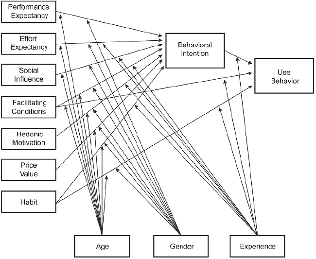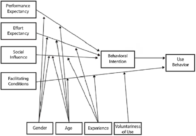The Unified Theory of Acceptance and Use of Technology (UTAUT) was developed by Venkatesh et al. (2003) based on the theoretical revision of eight different models or theories about technology acceptance and/or human behavior, through a discussion of concepts and applications in studies of the psychology of human behavior, motivation, acceptance and diffusion of technologies. The Theory of Reasoned Action (TRA) (FISHBEIN; AJZEN, 1975) influences, to date, studies on social behavior. The main constructs of TRA that influenced the formulation of UTAUT were: the intention to perform an action, attitude, behavior, and subjective norms.