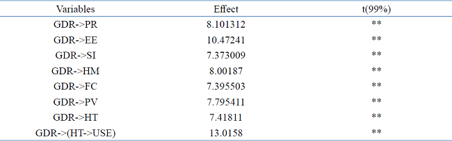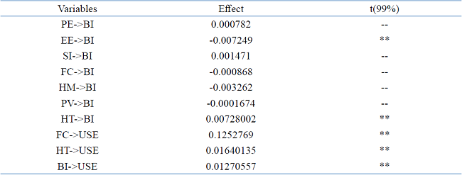 The effect of Habit on Behavioral Intention is 0.00728002 (p <0.01) and that of Social Influence is 0.001471, but in this case, it is not significant at p <0.01. Effort Expectancy has a significant effect of 0.007249 (p <0.01) on Behavioral Intention.