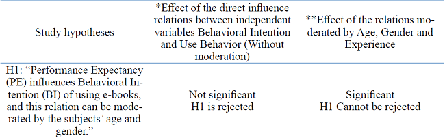 H1: Performance Expectancy (PE) influences Behavioral Intention (BI) of e-book use, and this relationship can be moderated by the age and gender of the subjects.