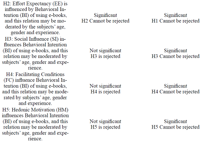 Table 10 summarizes the effects of the independent direct variables on the variables Behavioral Intention and Use Behavior of e-books, as verified in this research.