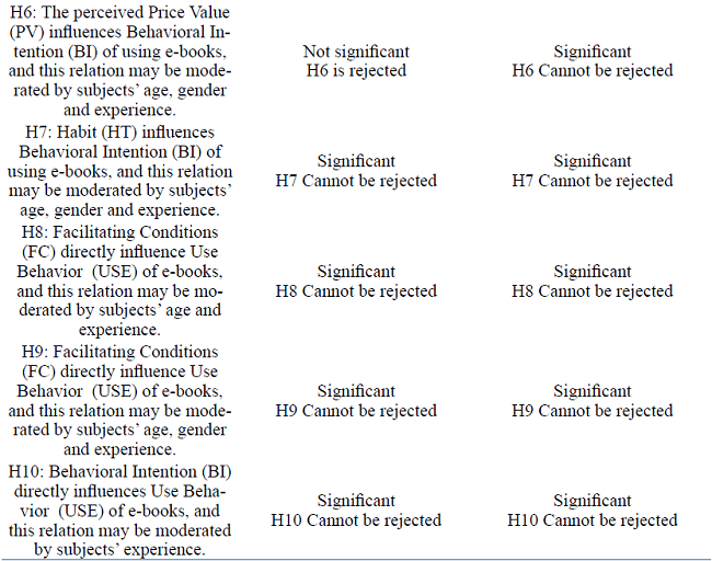 An important focus given to data discussion and hypotheses testing was the analysis of the effect that the moderating variables Age, Gender and Experience exert on the direct influence relation of the independent variables to Behavioral Intention and Use Behavior of the studied technology. As shown in Table 11, if the test is only to verify the significance of the effects related to direct relationships between independent variables and Behavioral Intention and Use Behavior of e-books, five of the hypotheses are rejected and five cannot be rejected. However, as can be seen in the second column of Table 11, when the age, gender and experience of the subjects are included, then all ten hypotheses formulated in this study cannot be rejected at p <0.01.