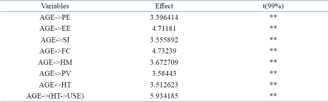 The effect of the direct relationship between Performance Expectancy (PE) and Behavioral Intention (BI) of e-books use (0.000782) was not significant at p <0.01. The relationship, when moderated by Age, had a significant effect (p <0.01) corresponding to 3.396414. When the relationship was moderated by Gender, the effect was 8.101312 (p <0.01).