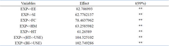 The variable Behavioral Intention (BI) is influenced by the seven other input variables presented in the model and, in turn, influences Use Behavior, and is also moderated by Experience. The effect of this relationship has a value of 0.012706 (p <0.01) and the effect of the Experience moderator with this relation is 102.749286 (p <0.01).