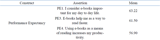 Initially, we verified the means of the values obtained on the 0 to 100 scale related to assertions PE1, PE3 and PE4 presented in Table 2, which deal with Performance Expectancy, presenting the following means: