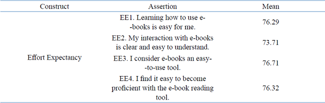 For the variable Effort Expectancy, we formulated the assertions EE1, EE2, EE3 and EE4, whose response means are presented in Table 3, with a scale varying from 0 to 100 points.