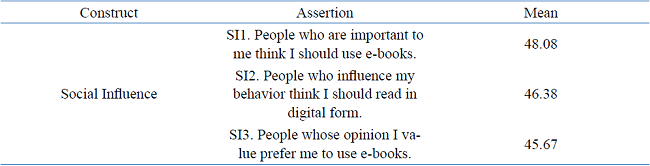 For the variable Social Influence (SI), we formulated the assertions SI1, SI2 and SI3, whose response means are presented in Table 4, with a scale varying from 0 to 100 points.