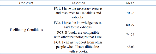 We formulated the variables FC1, FC2, FC3 and FC4 for Facilitating Conditions (FC), whose response means are presented in Table 5, with a scale ranging from 0 to 100 points.