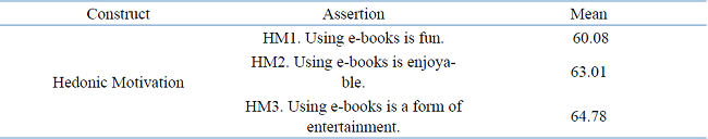 For the Hedonic Motivation variable (HM), we formulated the assertions HM1, HM2 and HM3, whose response means are presented in Table 6, with a scale ranging from 0 to 100 points.
